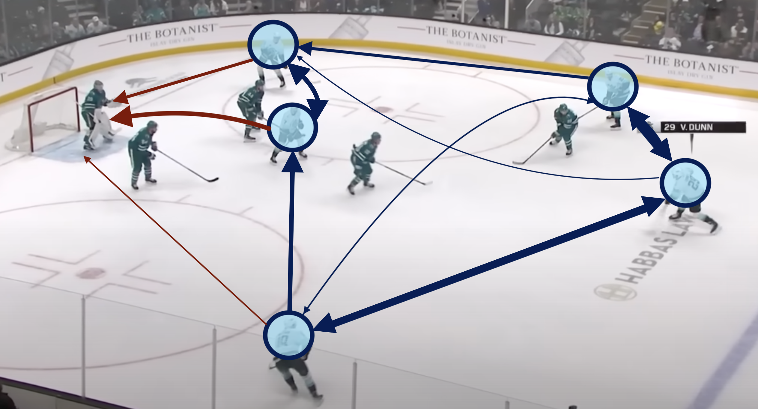 Betweenness is calculated by going over how often a player lies on the shortest path between nodes. Players ranking highly here are crucial facilitators who maximize their team’s passing routes toward shots. When Tomas Hertl was on the Sharks last year, he often acted as the main link between any two teammates, resulting in their offensive movement flowing through him.